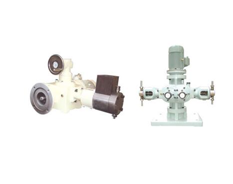 J系列計(jì)量泵分為柱塞式和液壓隔膜式兩種。電機(jī)與蝸桿剛性連接,蝸桿帶動(dòng)蝸輪通過(guò)曲柄連桿傳動(dòng),流量調(diào)節(jié)為可變偏心滑軸調(diào)節(jié)機(jī)構(gòu),平緩脈動(dòng)設(shè)計(jì)